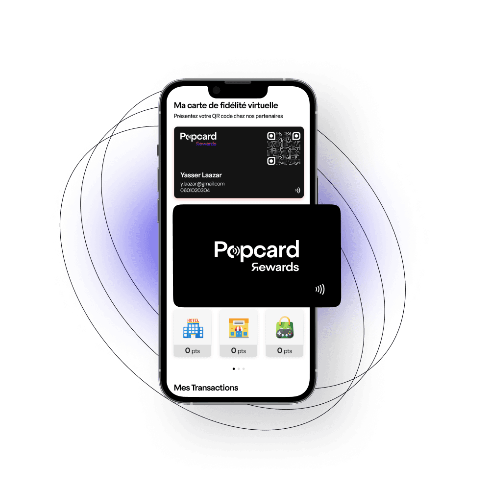 Une carte physique premium en PVC noir mat avec NFC et QR Code personnalisé, et une version virtuelle pratique accessible depuis le profil utilisateur avec QR Code